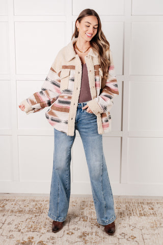 Stay cozy and stylish in our Sedona Sunset Shacket. This must-have item features a sherpa fleece panel, classic brushed Aztec patterned woven fabric, and side pockets. Button front closure keeps you snug in the mid to heavy-weight fabric, while the pockets provide convenience. Make a statement with our Sedona Sunset Shacket!