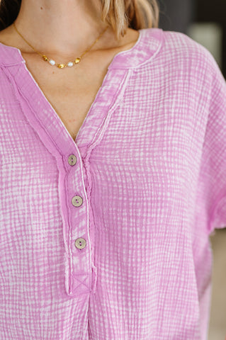 Our Basic Fade V-Neck Acid Wash Top is the perfect addition to your wardrobe. Made with lightweight gauze, it features a trendy v-neckline and functional 3/4 front button closures. The dolman sleeves and banded cuffs add a touch of flair, while the raw and exposed seams give it a unique edge. With a banded stepped hemline and side slit, this top is both stylish and comfortable.