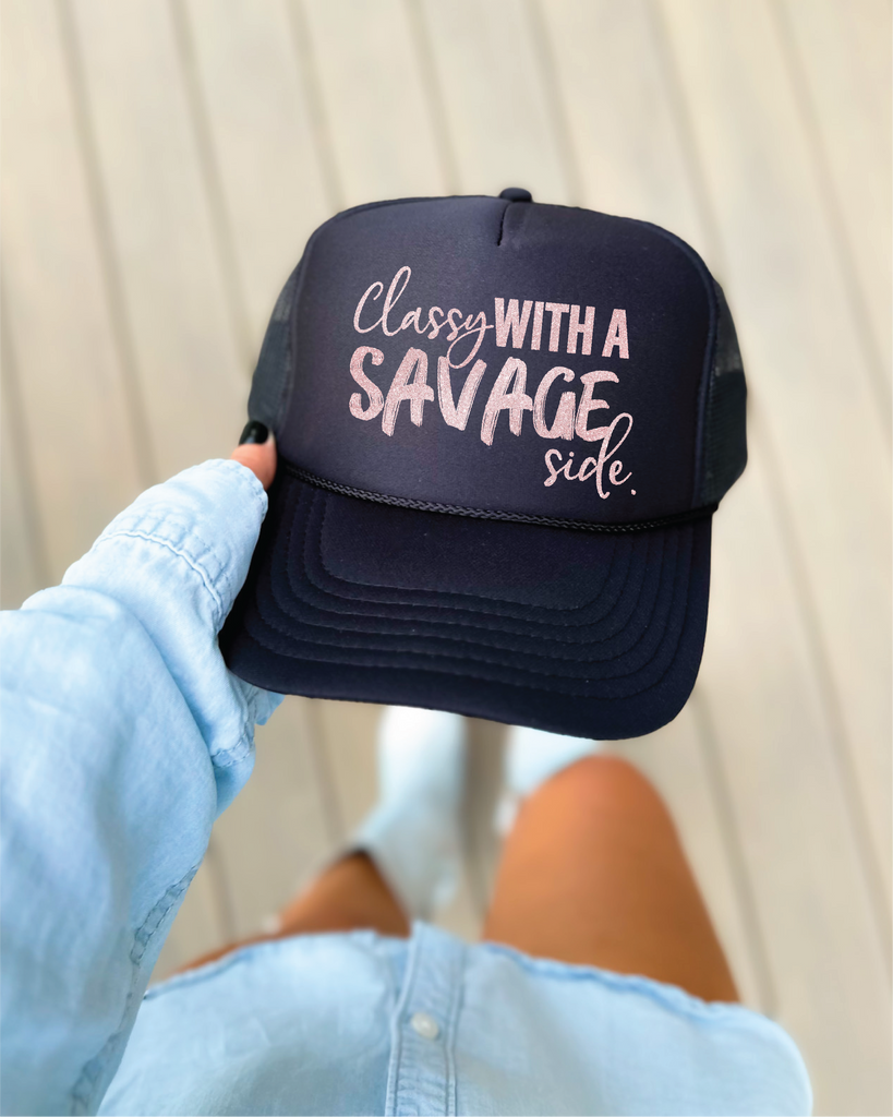 Classy With a Savage Side DTF Printed Black Trucker Hat