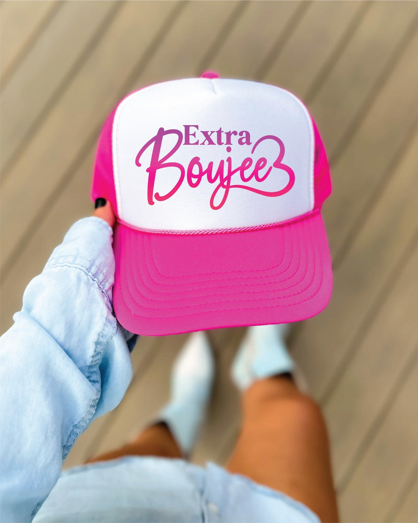 "Extra Boujee" design direct-to-film printed on a Hot Pink and White foam trucker hat. The perfect accessory to make a bold statement!