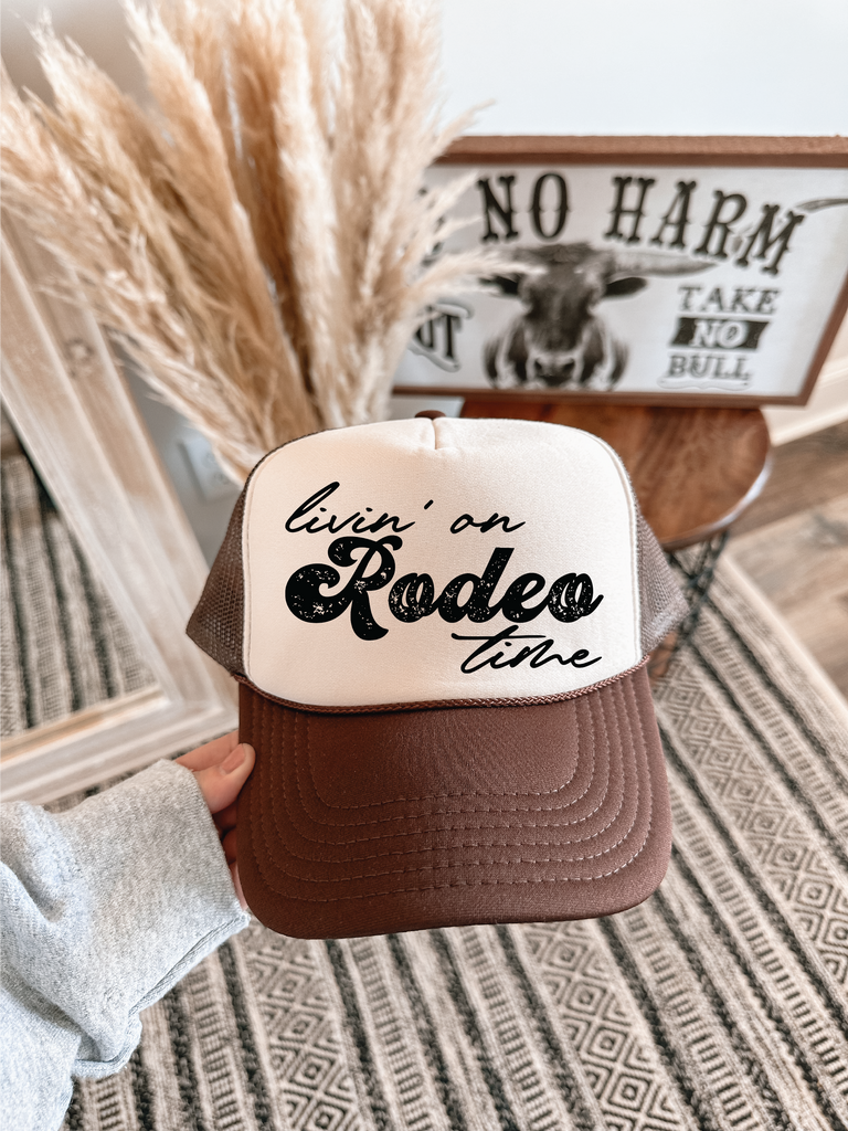 Livin on Rodeo Time DTF Printed Brown & Tan Trucker Hat