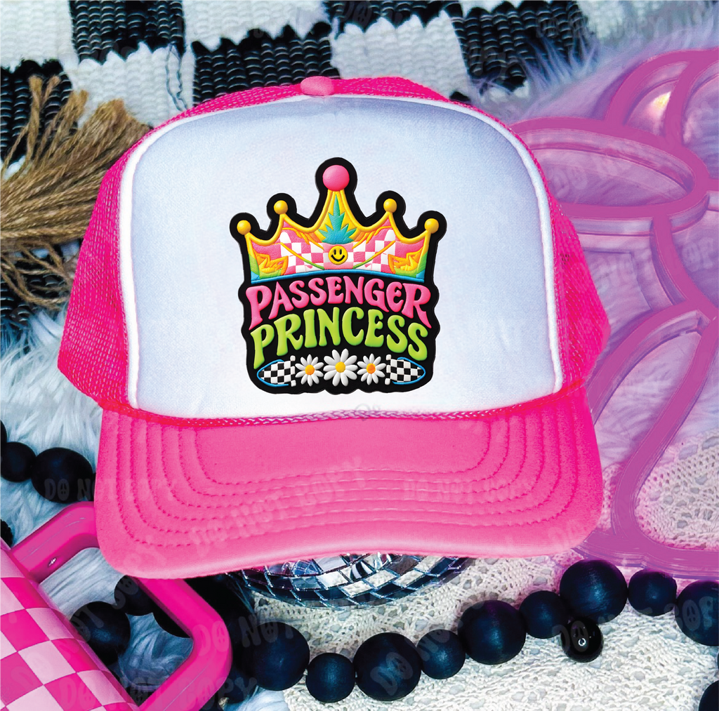 Passenger Seat Princess DTF Printed Neon Pink and White Trucker Hat