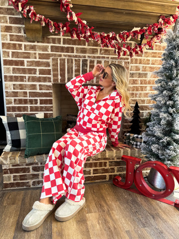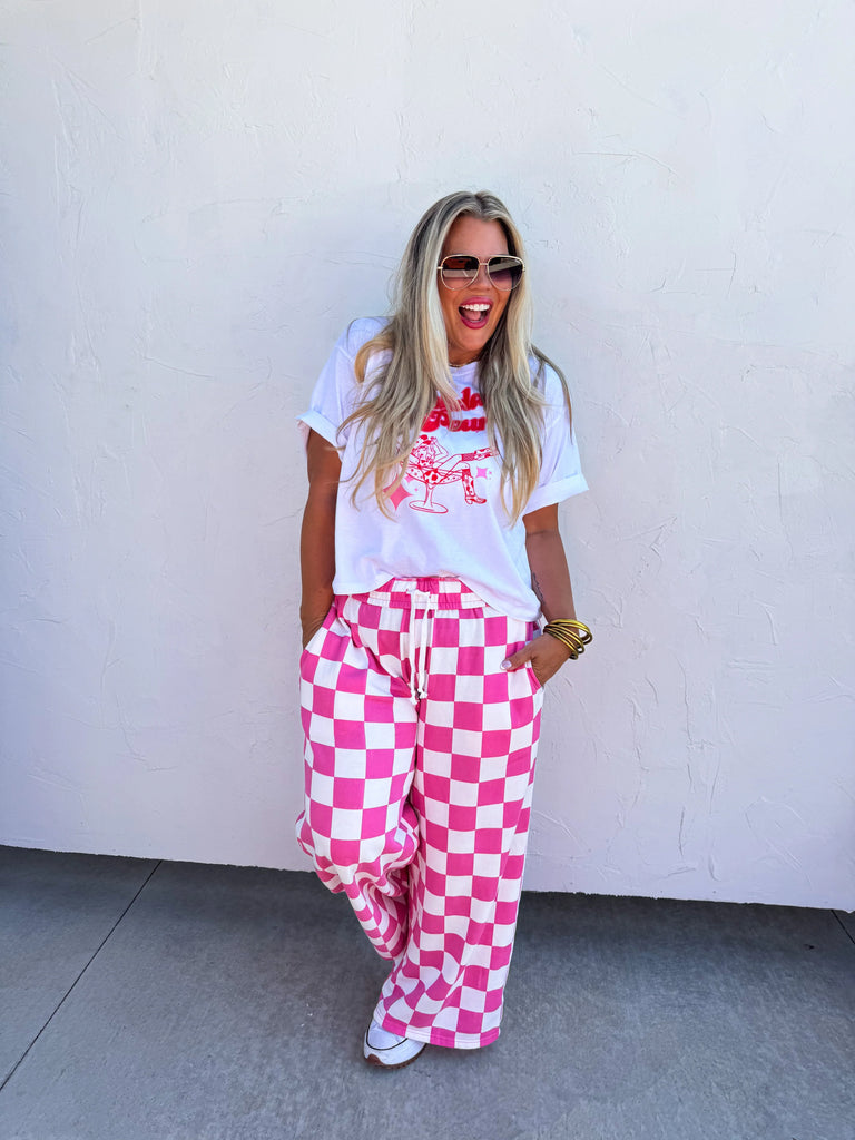 These printed and washed checker pants scream ultimate comfort and style! These trendy pants feature side seam piping details, side pockets, and elastic waist with tie string. The BEST part is they match our NEW checkered Easy Does It Pullovers!