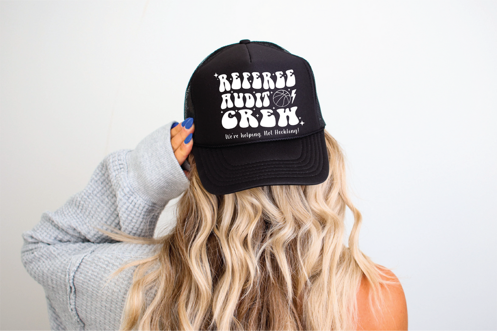 "Referee Audit Crew" design direct-to-film printed on a Black foam trucker hat. The perfect accessory to make a bold statement!