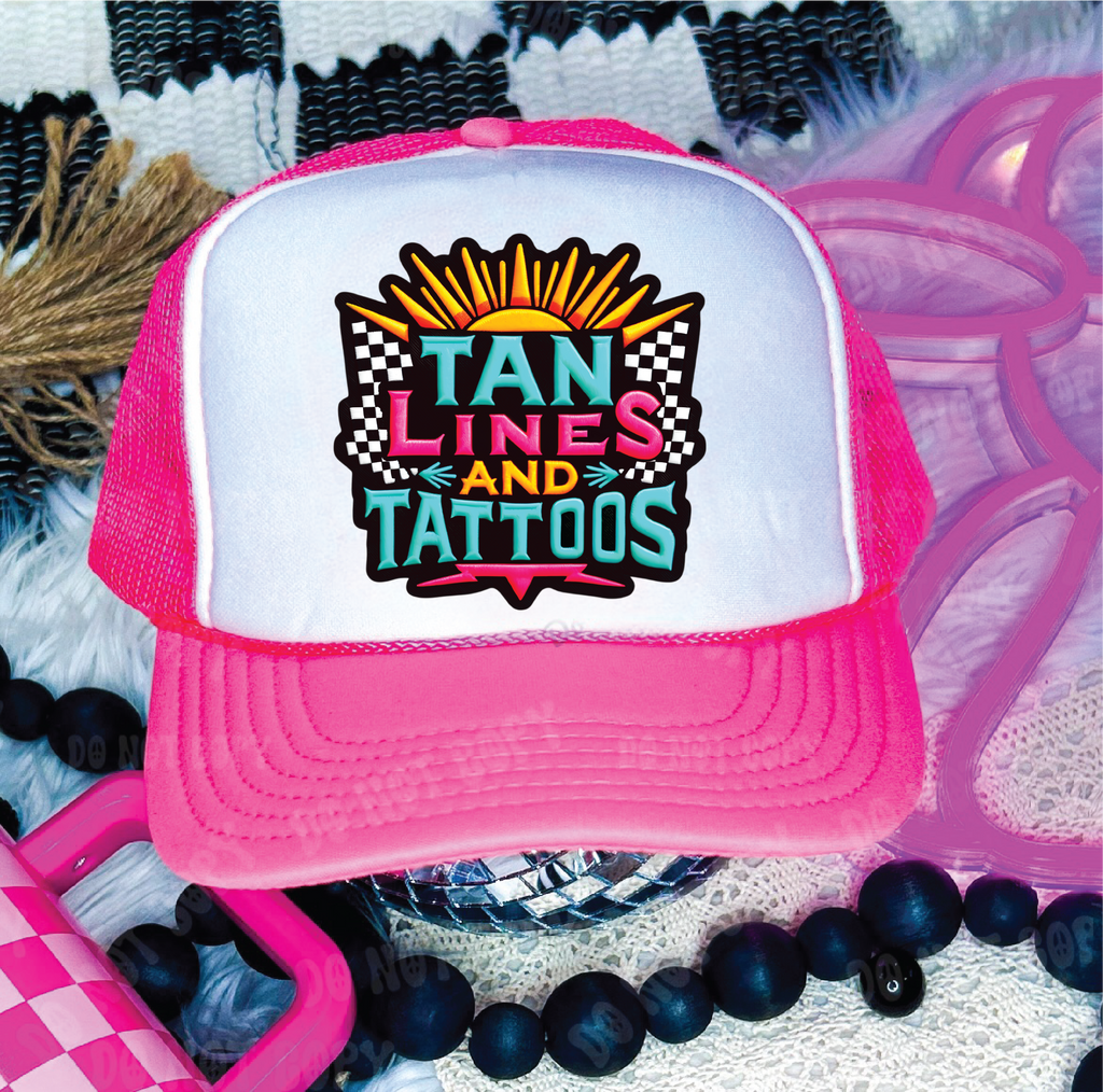"Tanlines and Tattoos" design direct-to-film printed on a Neon Pink & White foam trucker hat. The perfect accessory to make a bold statement!