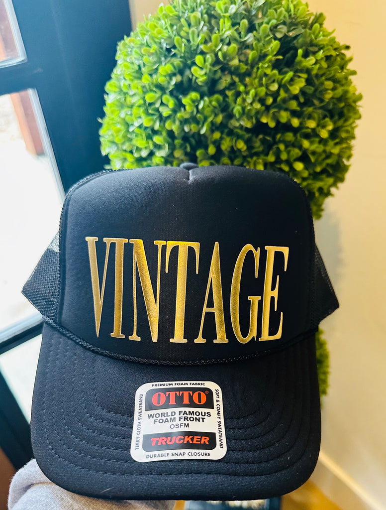 "VINTAGE" design is 3D Puff Vinyl Gold Metallic on a Black foam trucker hat. The perfect accessory to make a bold statement!